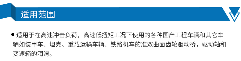 ●適用于在高速沖擊負荷,高速低扭矩工況下使用的各種進口、國產工程車輛和其它車輛如裝甲車、坦克、重載運輸車輛、鐵路機車的準雙曲面齒輪驅動橋,驅動軸和變速箱的潤滑。