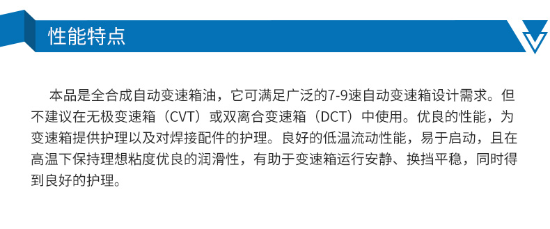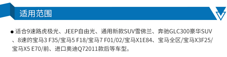 ●本品是全合成自動(dòng)變速箱油,它可滿足廣泛的7-9速自動(dòng)變速箱設(shè)計(jì)需求。適合9速路虎極光、JEEP自由光、通用新款SUV雪佛蘭、奔馳GLC300豪華SUV、8速的寶馬3F35/寶馬5F18/寶馬7F01/02/寶馬X1E84、寶馬全區(qū)/寶馬X3F25/寶馬X5E70前、進(jìn)口奧迪Q72011款后等車型。