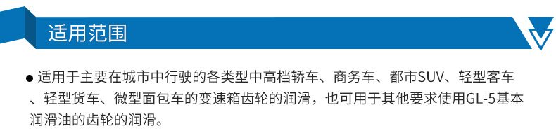 ●適用于主要在城市中行駛的各類型轎車、商務車、都市SUV、輕型客車、輕型貨車、微型面包車的變速箱齒輪的潤滑,也可用于其它要求使用GL-5級別潤滑油的齒輪的潤滑。高、低溫使用性能和較好的粘溫性,滿足頻繁的起步停車工況下的潤滑需求,良好的保護齒輪箱,如大油門起步及急剎車等運行條件;